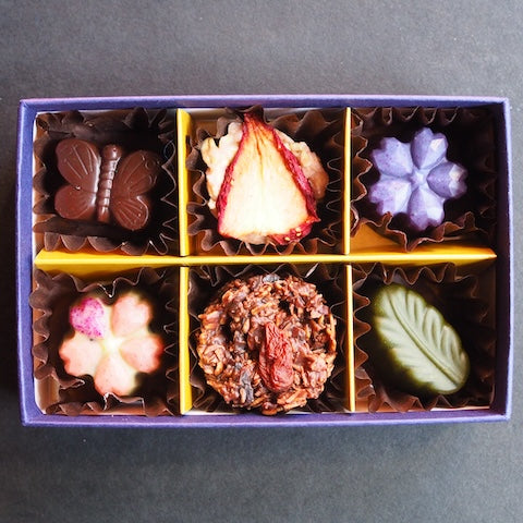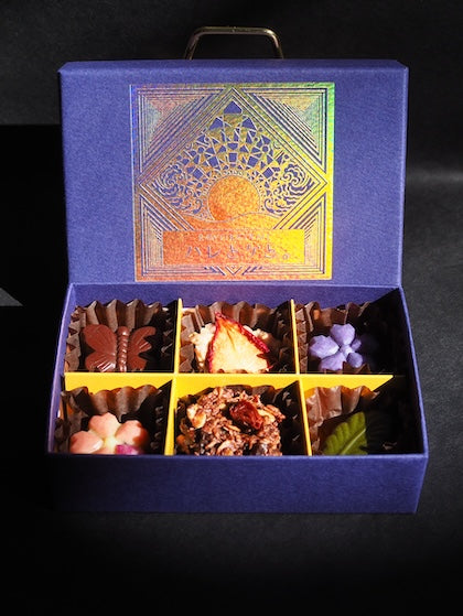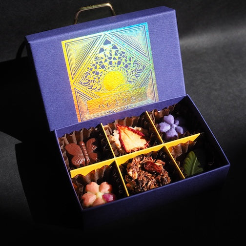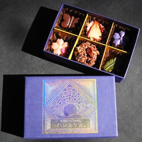 特殊箔が煌めく、上品で高級感漂うギフト箱に入ったローチョコレートアソート6個入り。