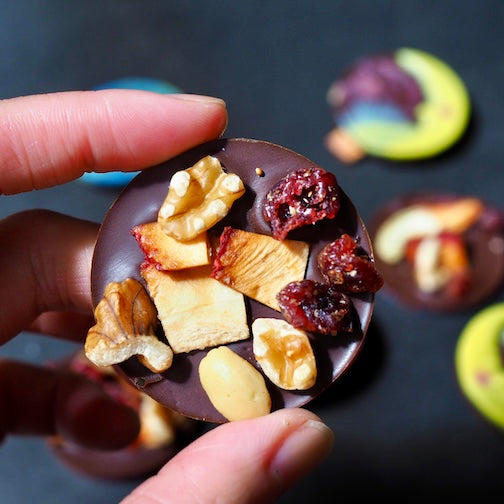 | 原材料 | 有機生カカオマス(エクアドル製造)、有機生カカオバター、有機ココナッツシュガー、有機アガベシロップ、クルミ、アーモンド、カシューナッツ、ドライクランベリー、栽培期間農薬不使用いちご(野洲産)、麻炭、栽培期間農薬不使用米粉、塩/着色料(ビーツ、ターメリック、ドラゴンフルーツ、クロレラ粉末、スピルリナ青色素)、(一部に クルミ、アーモンド、カシューナッツを含む) |
